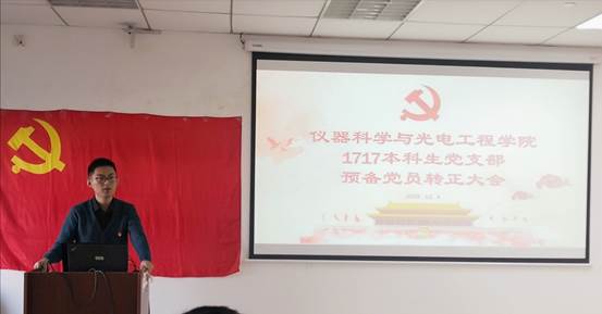 2019124日下午,1717本科生党支部于新主楼B707召开预备党员转正大会,此次会议讨论了关于汪欣然、陈旭、柳姝姌、贺雪倩及黄超五名预备党员的转正问题。本次大会由党支部书记冯天轩同志主持,全体党员参与会议。