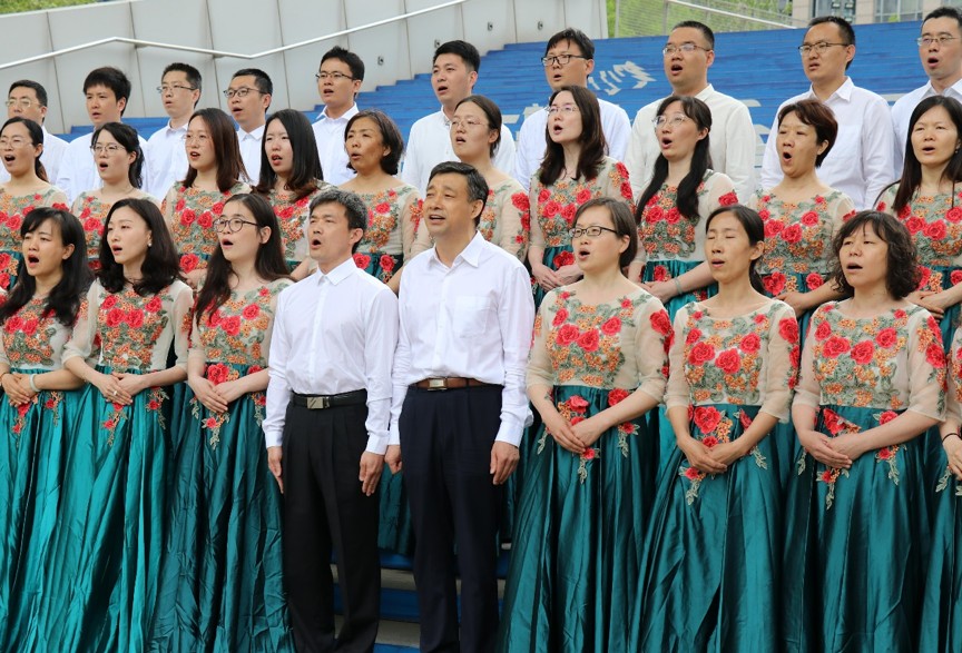 经过多次排练,由60位教职工组成的william威廉中文官网合唱团于4月21日中午在新主楼大台阶前进行正式演出。男老师们身着白衬衣、黑裤子,精神抖擞,气宇轩昂;女老师们一袭款款长裙,落落大方,端庄素雅。大家热情饱满地演唱了《没有共产党就没有新中国》和《我和我的祖国》两首歌,展现了仪器光电人的靓丽风采。