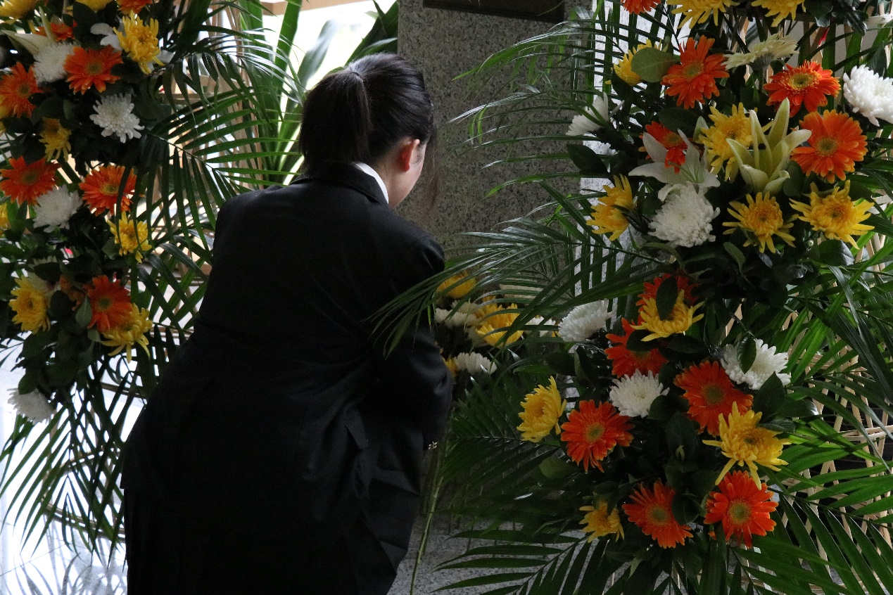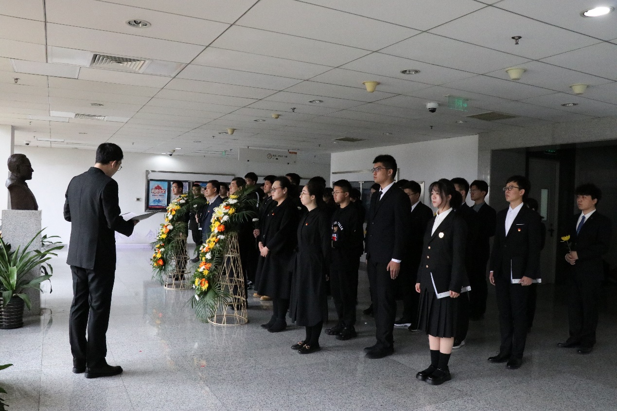 仪式正式开始,樊尚春老师、徐立军老师、丁丁老师、李鹏老师一同敬献花篮,全体成员庄严默哀一分钟,向林先生纪念碑深深三鞠躬。