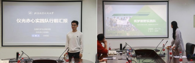 接着,仪光赤心实践队队长孙峙宏和筑梦新野实践队队长赵晨鹭分别汇报了实践队的背景意义、实践内容、筹备工作和预期成果。仪光赤心实践队以“红色循迹”为实践主题,在抗战胜利八十周年来临之际,以历史访学、特区调研、赤心讲堂为主线,在实践中讲好北航故事、传播红色文化。筑梦新野实践队积极响应2024中央农村工作会议上“扎实推进乡村振兴”的战略要求,以“乡村振兴”为实践主题,探索新质生产力典型案例,依托数字赋能技术打造线上博物馆,助力非遗文化的保护与传承。