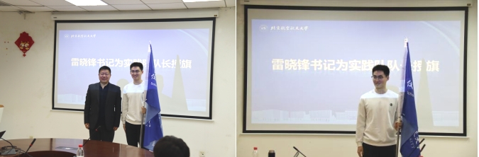 雷晓锋老师向社会实践团队授院旗,实践队代表孙峙宏同学接旗并进行承诺发言,表示必将牢记安全意识,履行队长职责,以实际行动诠释初心,带领队员为学校和学院添彩。