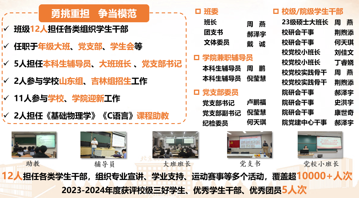 成为光,榜样光辉支撑。班级以“果毅力行”作为员工工作的核心主题,激励员工骨干在面对员工工作时果断坚毅,勇挑重担,争当模范,涌现出本科生辅导员、大班班长、党支部书记等12位员工骨干,负责组织的专业宣讲、学业支持、员工媒体、运动赛事等活动覆盖超1万人次,展现出了较高的综合素质。