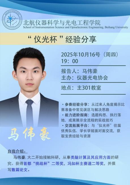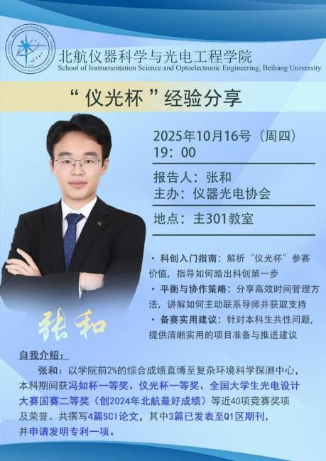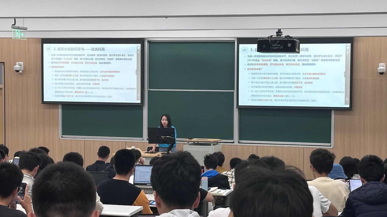 为帮助同学们更好地参与科研活动、备战“仪光杯”竞赛,10月16日晚19:00,仪光科协在主楼301教室举办了“仪光科苑”介绍暨“仪光杯”经验分享会。现场气氛热烈,干货满满。