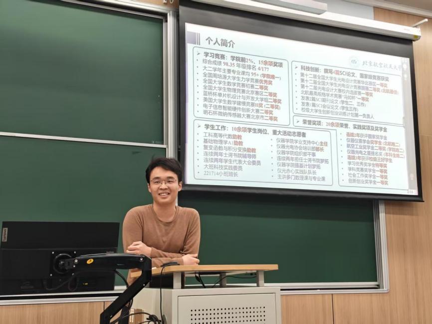 张和学长学习成绩名列前茅(学院前2%,综合成绩98.35),曾获得15余项竞赛奖项与20余项荣誉,并发表4篇SCI论文,科研成果显著。他以“仪光杯”为中心,结合自己的科创经验与比赛经历,从仪光杯的进程与规则、如何平衡时间与项目投入、参与仪光杯的收获、如何正确联系导师、科研如何初步入门等11个方面进行了细致入微的分享与讲解。从PPT的字体设计、发送邮件的语言措辞,到科研过程中对心态的磨练、潜在的成长与收获,学长把自己的心路历程与经验见解娓娓道来,让同学们对“仪光杯”与科研实践有了更清晰、具体的认识。