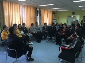 接着,两个队的同学进行了默契上的大比拼。培训师让每个组的同学坐成一排,每位同学只能看见前面同学的后背。在不发出声音、不能往后看、不能肢体接触的情况下把信息从末尾最后一位同学传递到最前一位同学,信息传递正确的组别将胜出。该游戏考验了每个团队的沟通能力和团队合作精神。在传递信息的过程中,因为不能看也不能发出声音,大家遇到了很多困难,在游戏的过程中,两组同学反思遇到的问题,可能出现的信息等,集思广益,最终两组同学都传递了正确信息。