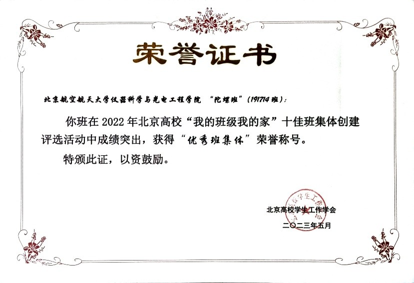 william威廉中文官网“陀螺班”坚定知行合一,永葆核心定力,传承红色基因,矢志空天报国,最终获得北京高校“我的班级我的家”优秀班集体荣誉称号。